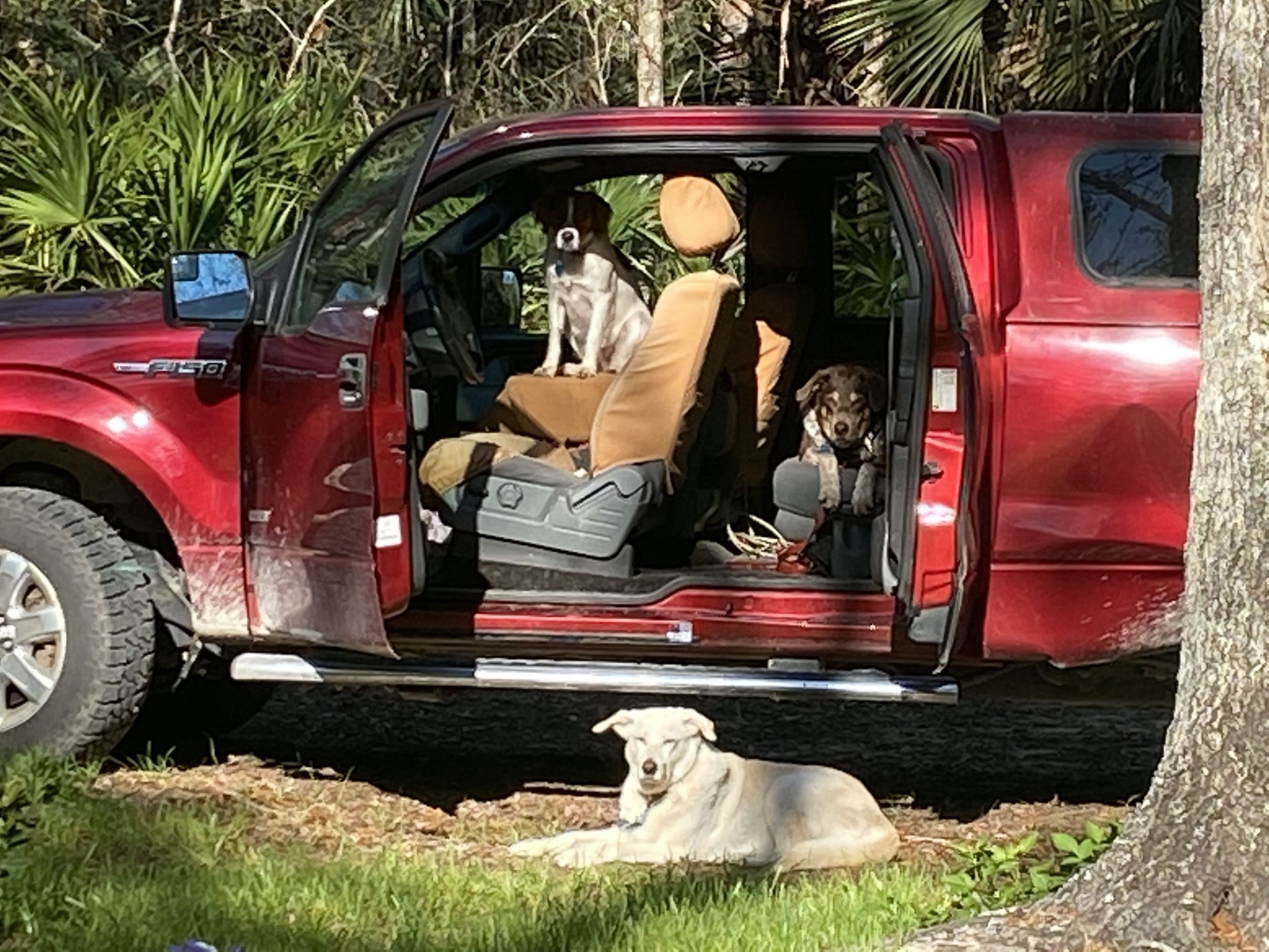 Some afternoons, Pluto, Noodle, Luna (3 dogs) and I, go for a drive.  We go to find new places; pretty neighborhoods, dog-friendly parks, quiet woodlands.  Last spring, I came across, what has since become my favorite Sunday outing.  Riverwood Drive is gorgeous.  It’s a beautiful drive, it’s a Sunday-afternoon-kind-of drive.  An eclectic variety of comely homes surrounded by elegant lawns look out over Lake Rousseau.  Along both sides of the narrow, winding road, live oaks wear sleeves of Spanish moss.  On the west side of the lake is where you can find the Inglis dam and recreation area.  Plenty of parking, several boat ramps, three large covered dock/jetty’s with picnic tables.  Glorious views and breezes fill and inspire. The actual dam is loud, angry water squeezing through the spillway.   Yeah,… we don’t dawdle there; makes us nervous and all three dogs pull on their leads to reach other side of the dam.  A picnic meadow with a pavilion and off at the far end, trails curl through rich woodlands.  On this Sunday afternoon, the pine bark is made vibrant under the sun’s auburn-colored light.  The trails, used by horses, bicyclists and couples walking hand-in hand, wind around for several miles,  although on this Sunday afternoon, it’s just us.  Beautiful place to live close to.  How lucky am I?